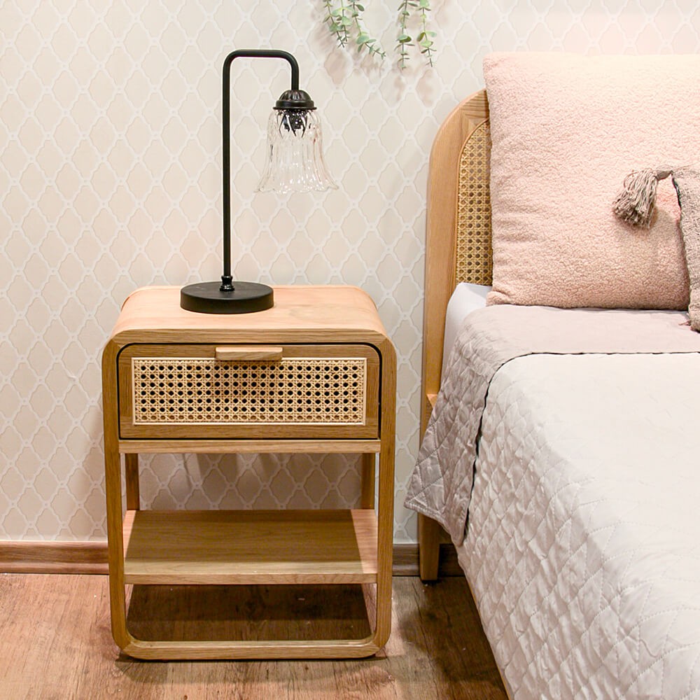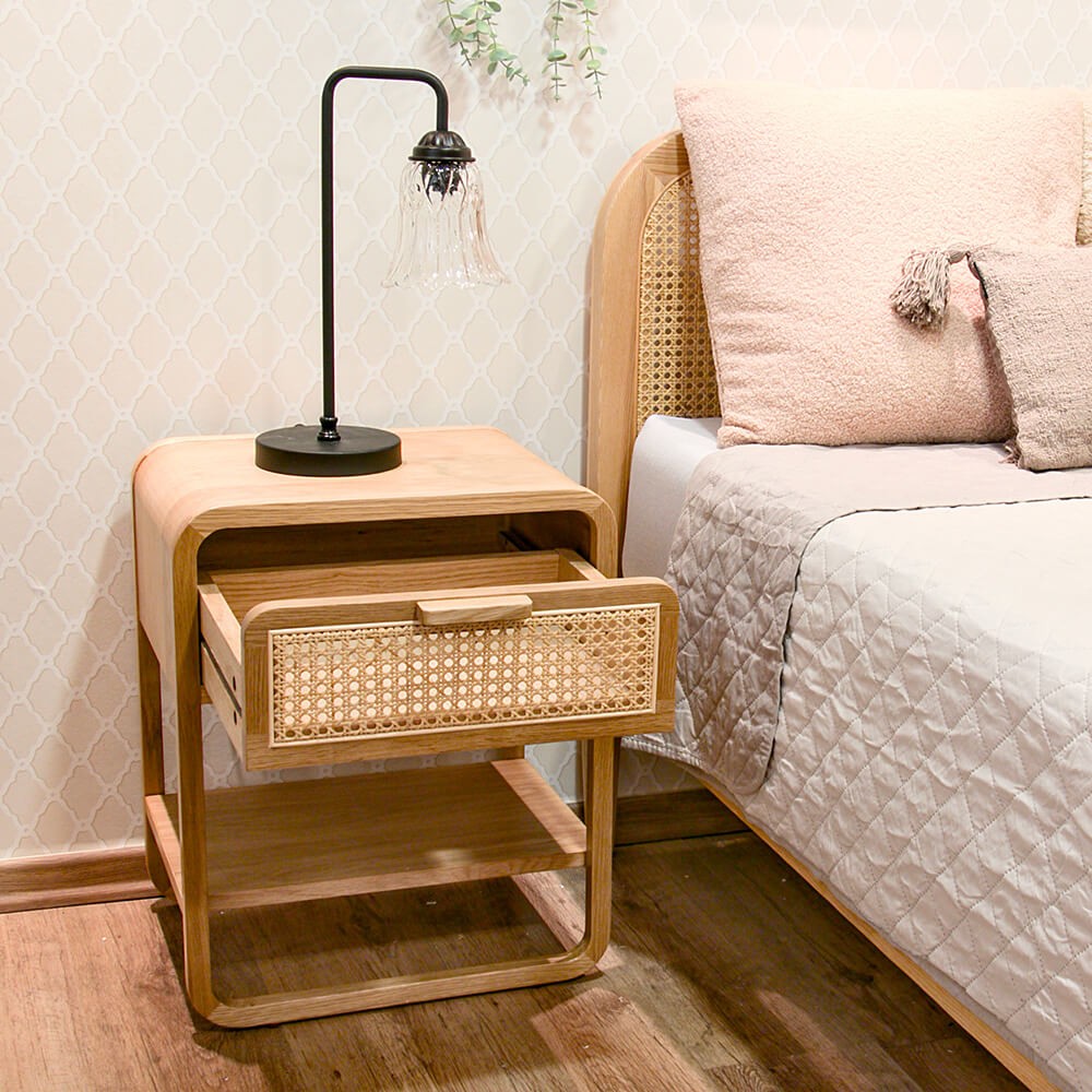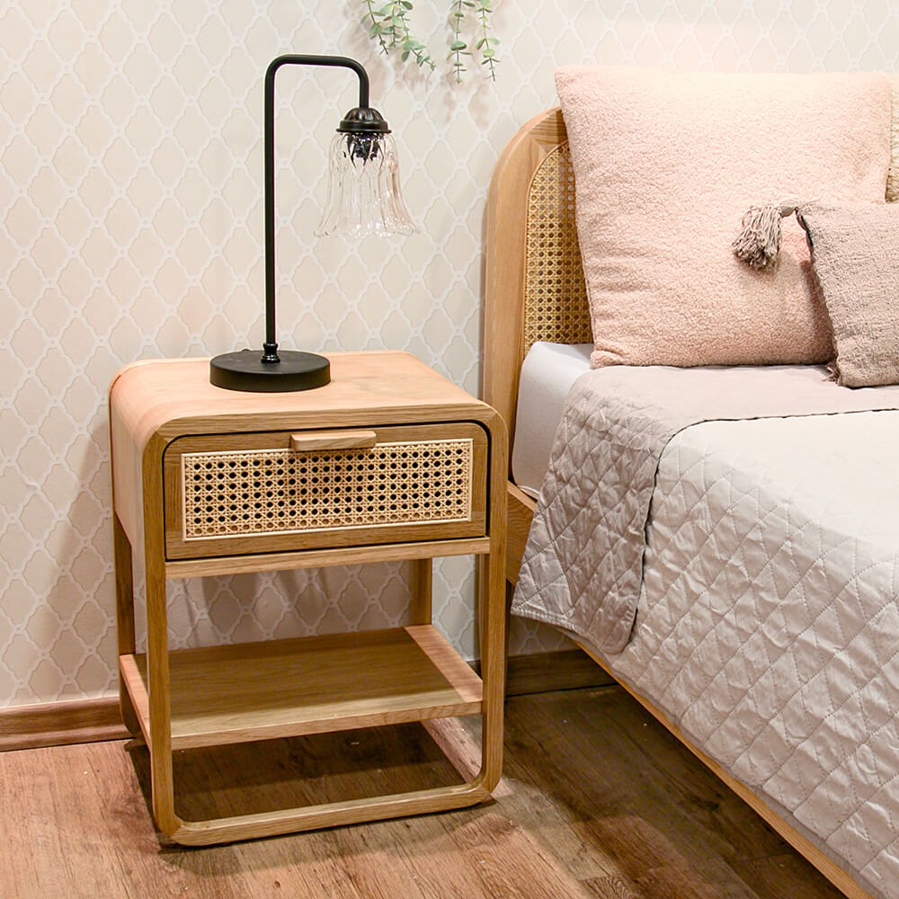 שידה בעיצוב נורדי בשילוב עץ וראטן, בעלת מגירה ומדף תחתון, רהיט איכותי בגימור מעולה