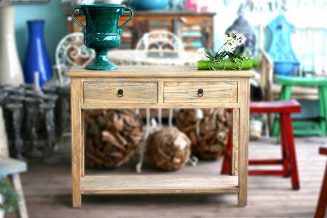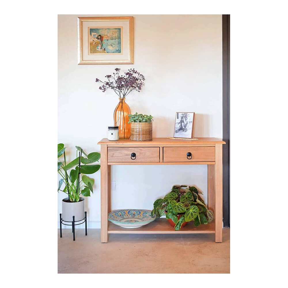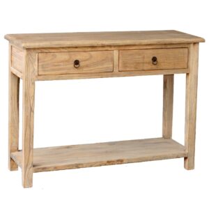 קונסולה מעץ טבעי מלא לכניסה לבית. השידה מיוצרת מעץ בוקיצה (Elm wood) מלא ואיכותי ומעוצבת בסגנון כפרי בגוון עץ טבעי וחם, מבנה נגיש וקלאסי של שתי מגירות גדולות לחפצים ומדף גדול ופתוח לכל האורך. הרהיט מושלם לעיצוב הכניסה לבית