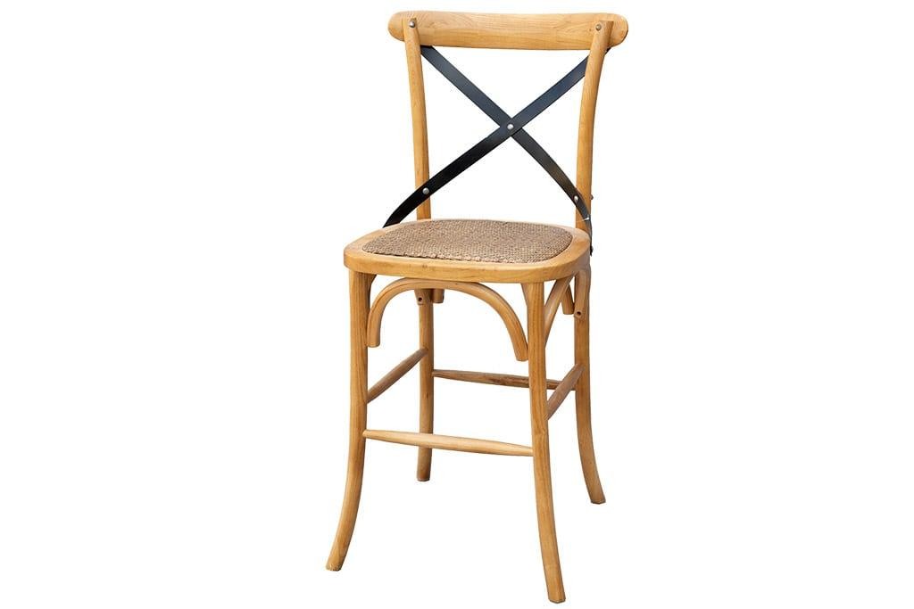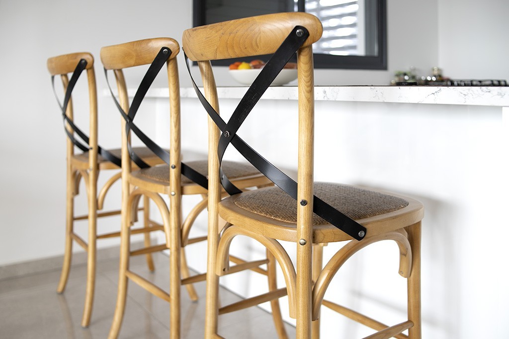 כסא מעץ מלא עם משענת המעוצבים בסגנון כפרי הכולל מבנה נוח לישיבה ממושכת עם משענת מעוגלת וחובקת, משטח ישיבה מרופד וחיזוקים ברגליים וגוון צבע של אגוז כהה עם ציפוי לכה המדגיש את הטקסטורה הטבעית של העץ המלא. גובה המושב הוא 65 ס”מ המתאים לדלפק או בר בגובה 90 ס”מ. כיסאות כפריים ואיכותיים במיוחד ברמת הגימור הגבוהה ביותר של הדגם