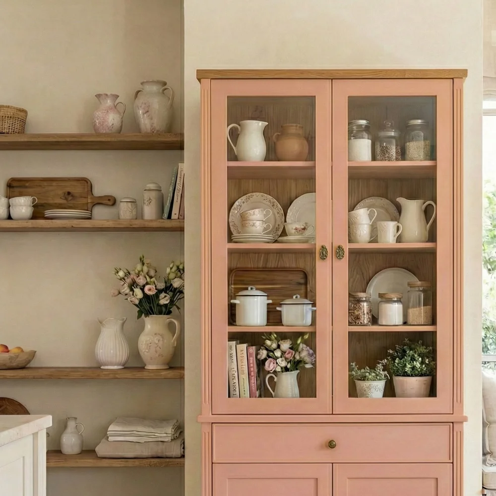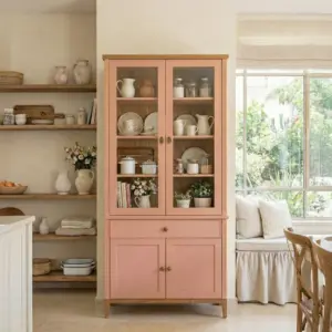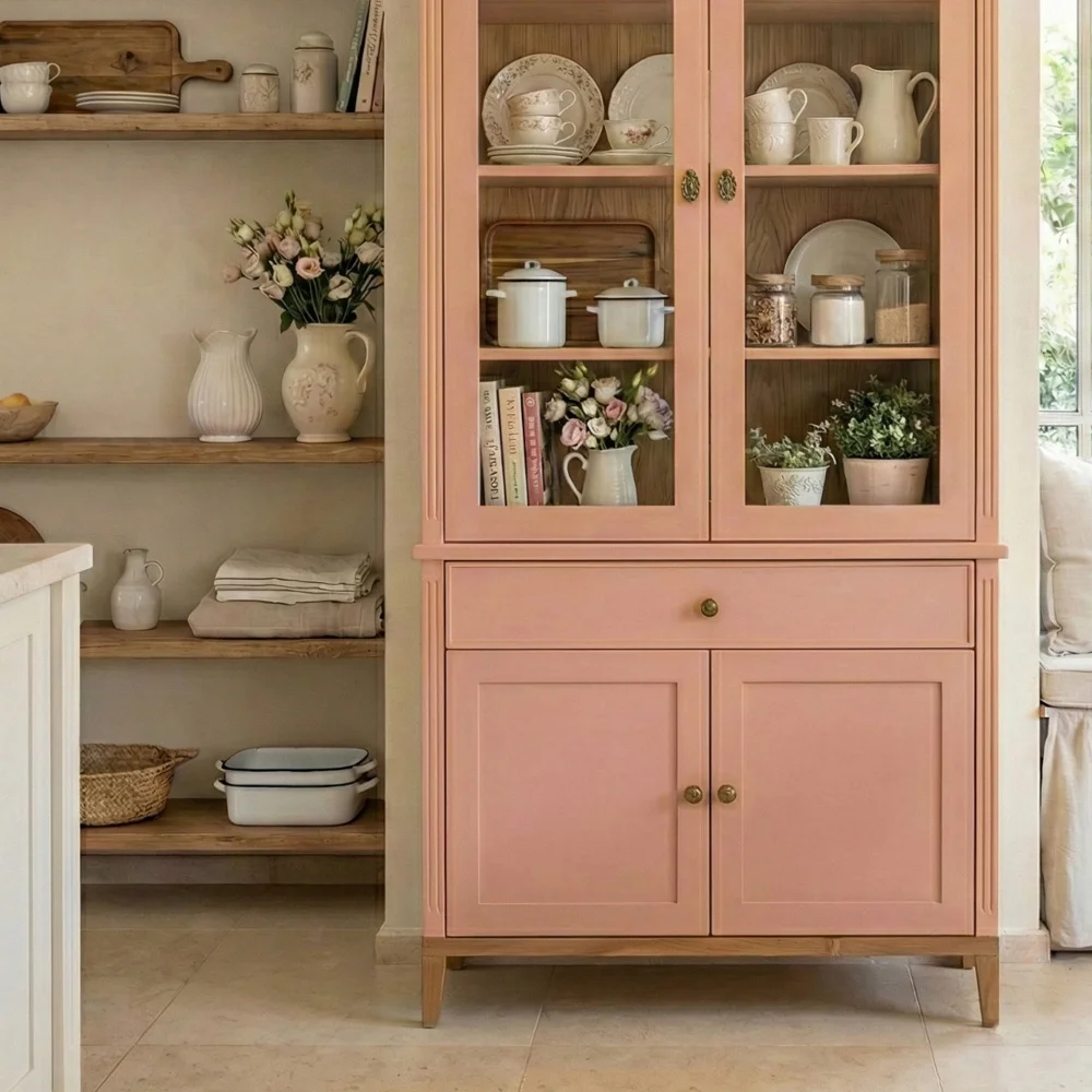 ארון מרשים ומעוצב, 2 דלתות זכוכית גדולות מעוצבות עם 4 מדפים, מגירה ושתי דלתות תחתונות, ידיות בגוון פליז