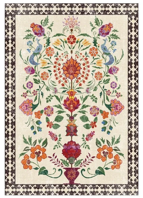שטיח מעוצב בצבעים בהירים עם גבול כהה, מתאים לסלון מודרני.