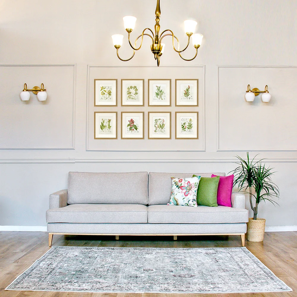 תאורה מעוצבת לסלון עם ספות וכורסאות, שטיחים ונברשות יפיפיות לקירות הבית.