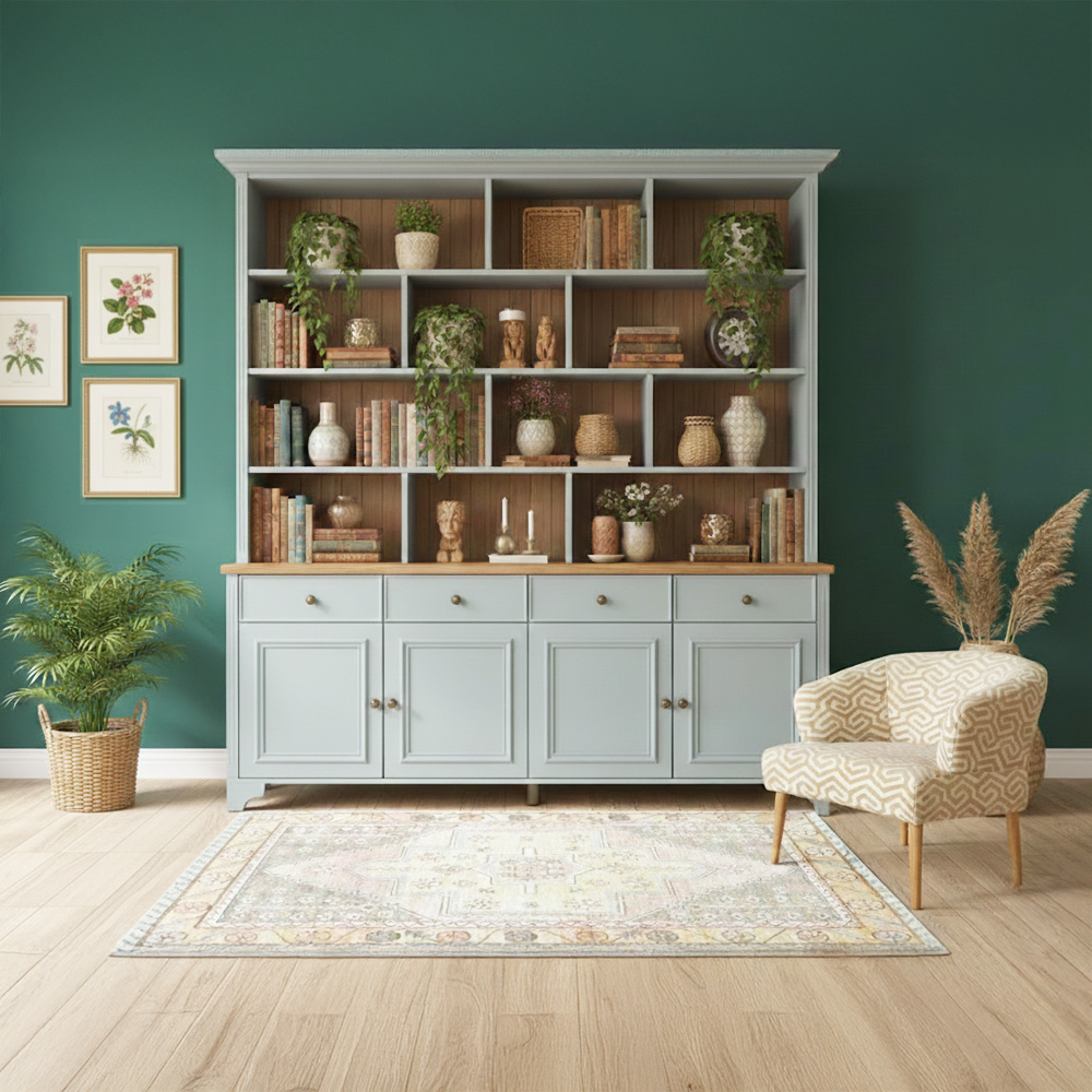 ספרייה רחבה ומרשימה, המשלבת תאים פתוחים וסגורים. 4 מדפים מחולקים לתאים, 4 דלתות מעוצבות ו 4 מגירות, ידיות בגוון פליז ורגלי עץ מעוצבות.