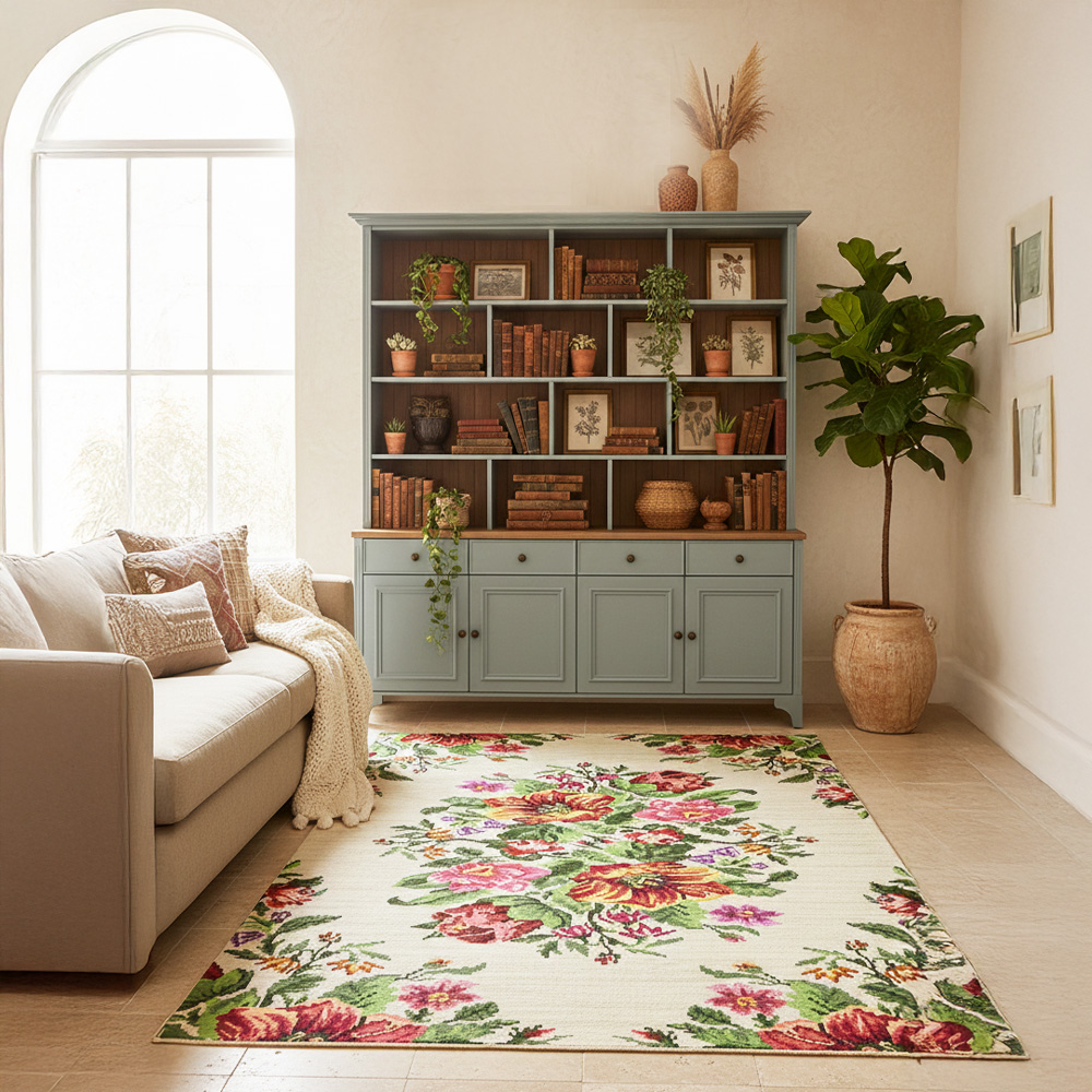 שטיח מעוצב בצבעים בהירים עם גבול כהה, מתאים לסלון מודרני.