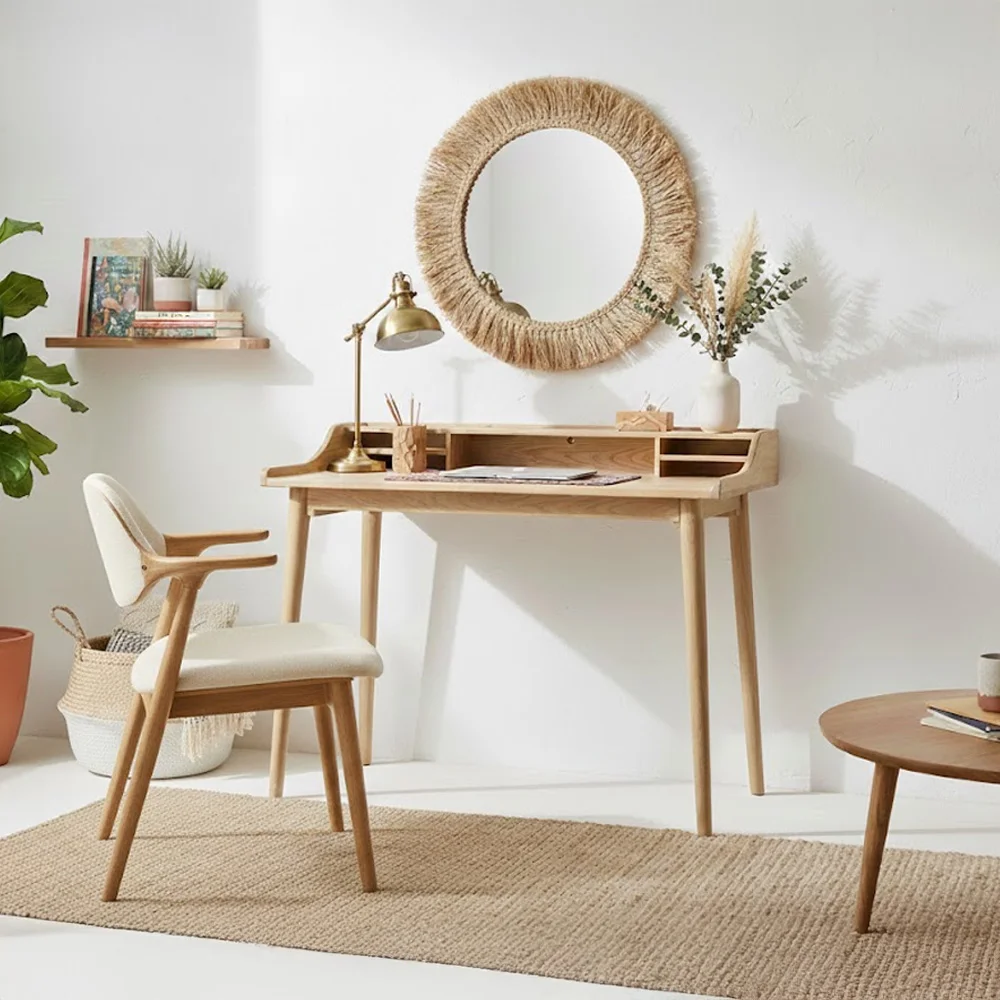 המכתבה מיוצרת מעץ טבעי מלא בגימור מעולה, עם מדפים קומפקטים ותאי אחסון, רהיט מעוצב במראה טבעי, לחדר השינה או פינת העבודה