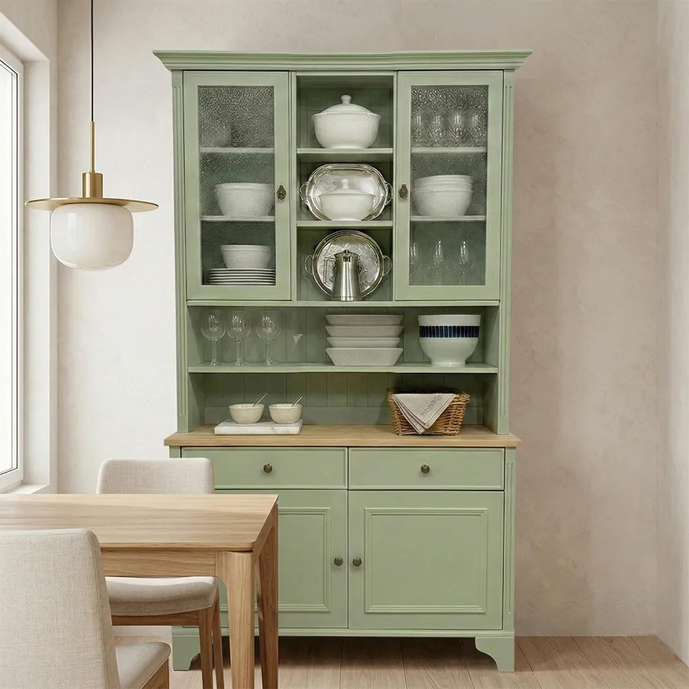 ארון ספרייה מרשים ומעוצב. בעל תאי אחסון גדולים, 3 מגירות מעוצבות ומדפי תצוגה פתוחים במראה כפרי בשילוב דלתות עם זכוכית סבתא.