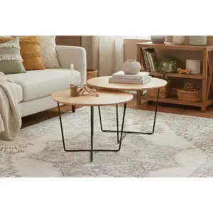 שולחן עגול מינימליסטי עשוי מפורניר אלון ורגלי מתכת. מתאים כזוג שולחנות.