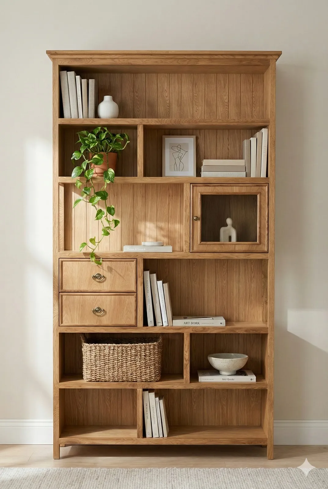 ספרייה מעוצבת בקווים נקיים, עשויה פורניר אלון בשילוב אלון מלא, בעלת 5 מדפים, תא סגור בדלת עם זכוכית סבתא ושתי מגירות, ידיות פליז בסגנון עתיק