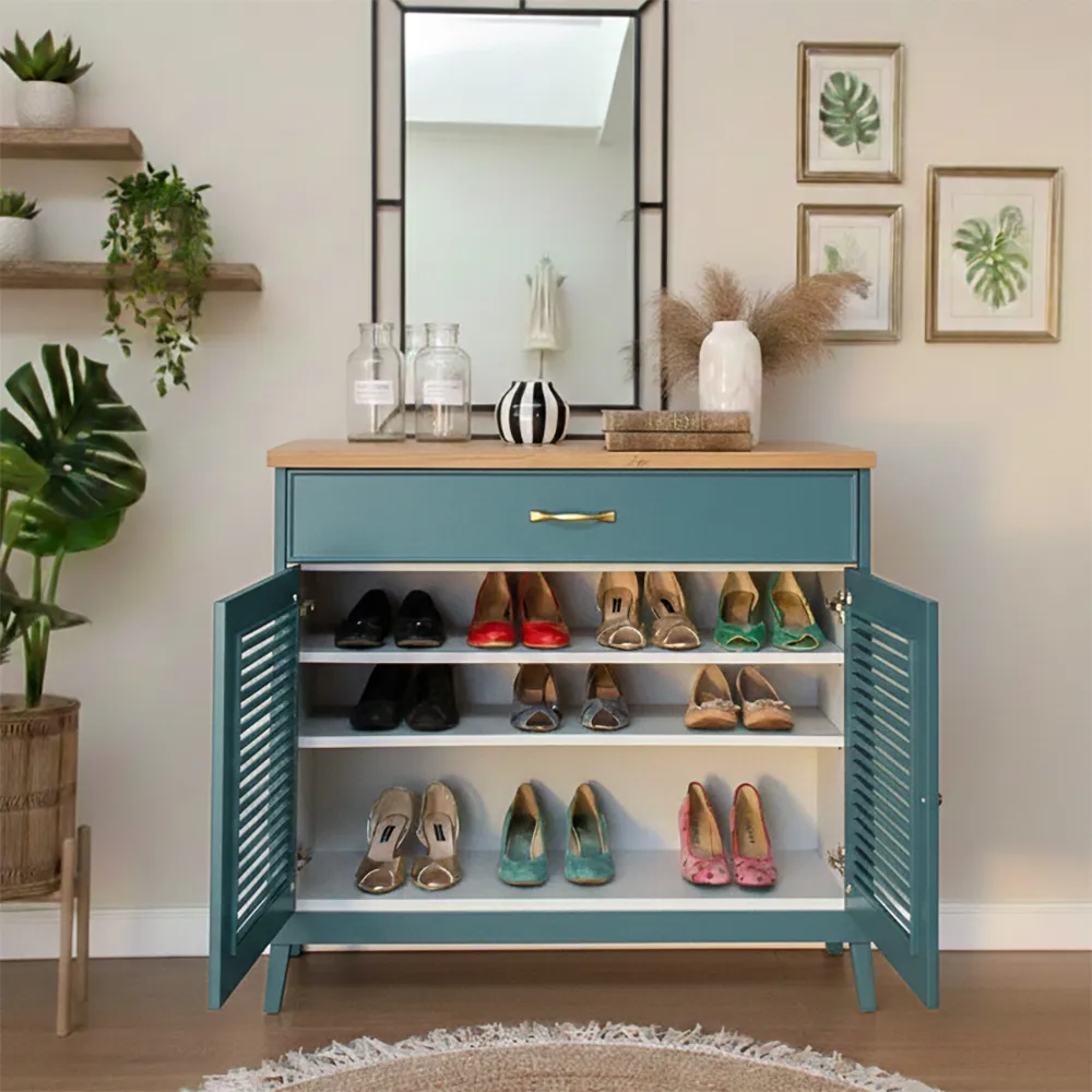 שידת כניסה “קארי” אשר מתאימה גם לאחסון נעליים בזכות דלתות התריס המאווררות