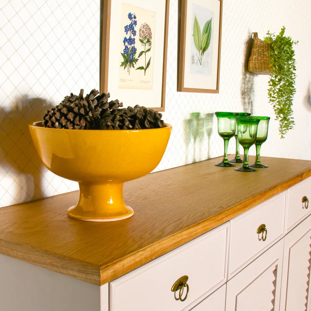 עשויה אם די אף, משלבת בחלקה העליון פורניר אלון ואלון מלא. עשויה בעבודת יד מוקפדת עם ידיות פליז מעוצבות