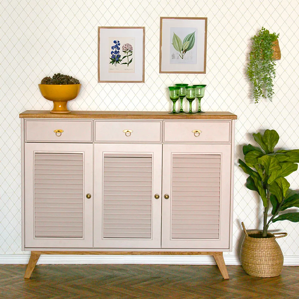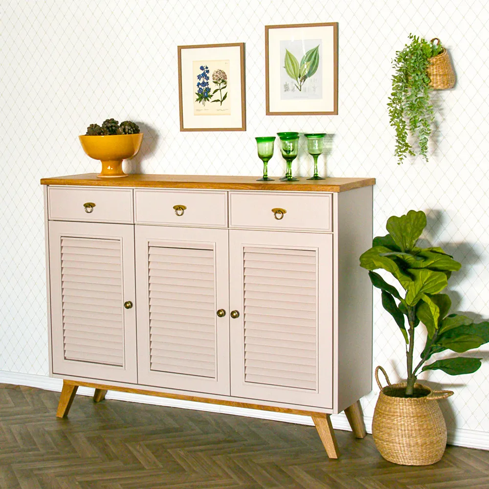 שידה מעוצבת קארי משולשת, שיקית ואלגנטית, בעלת 3 מגירות ו3 דלתות תריס היוצרות אוורור צבע ורוד פודרה 0126 נירלט