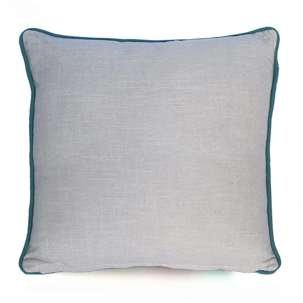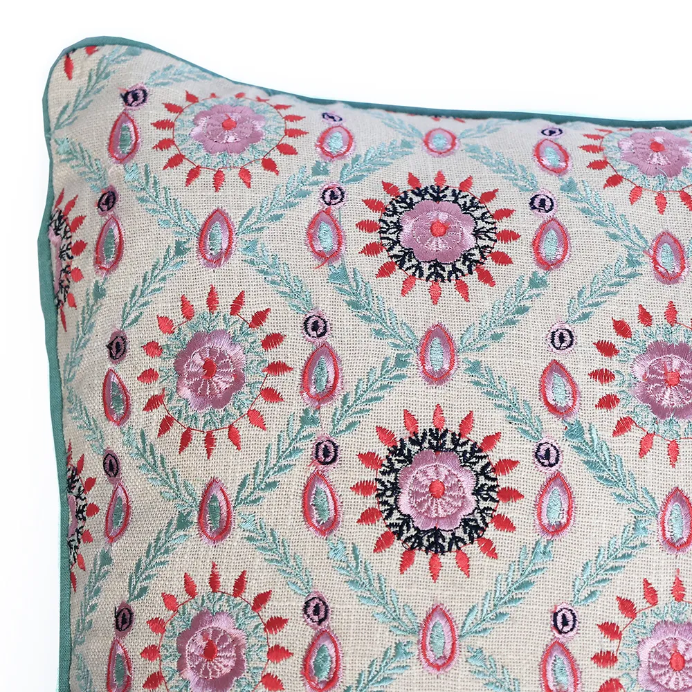 גוון הבד טבעי ועדין, עם רקמה מרהיבה בצבעי טורקיז ואדום, שילוב שמכניס חיות וסטייל מבלי להשתלט על החלל.