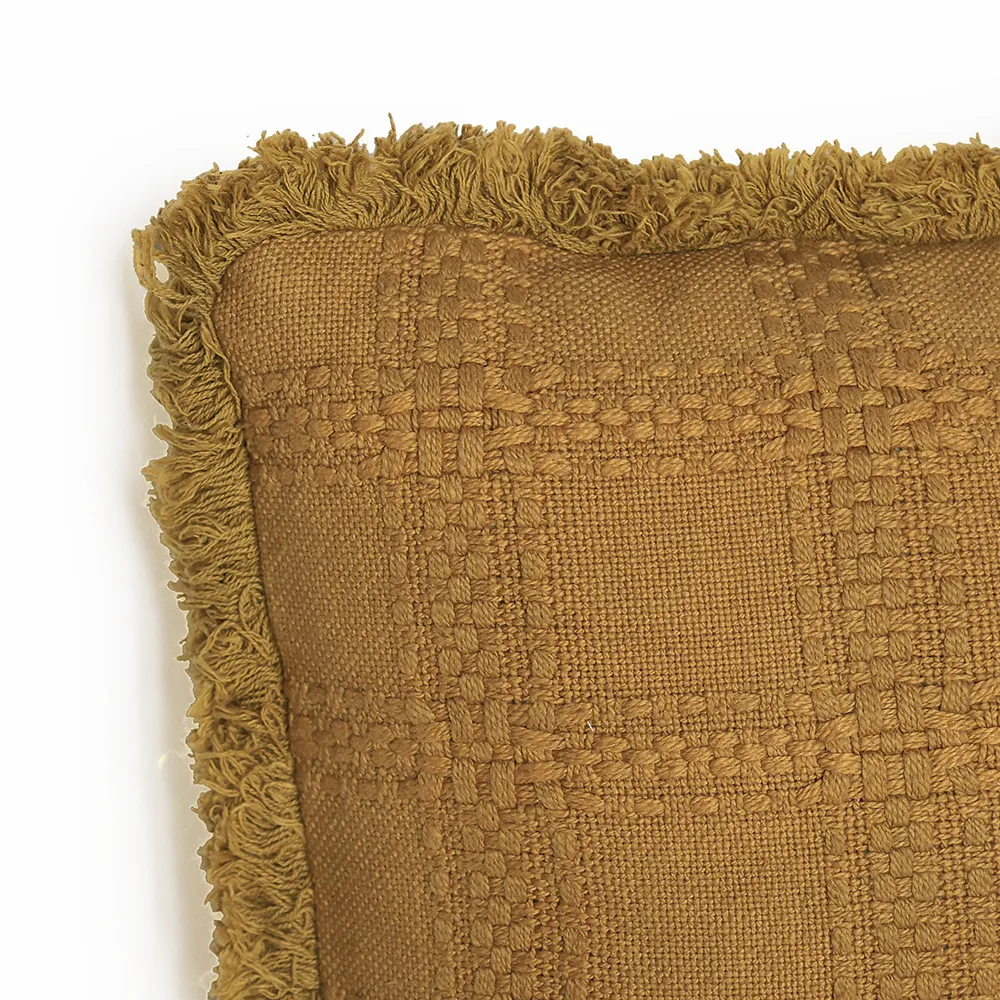 הכרית בגוון חרדל חמים, עשויה מבד כותנה נעים בעל טקסטורה עדינה, ומעוטרת בפרנזים דקורטיביים בצבע תואם המקיפים את הכרית.