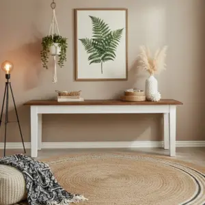 מיוצר מעץ מלא עם משטח עץ טבעי עליון ובסיס בגוון שמנת מעודן. מתאים לפינת אוכל, לחדר השינה, לכניסה לבית או לפינת אוכל בגינה או במרפסת.