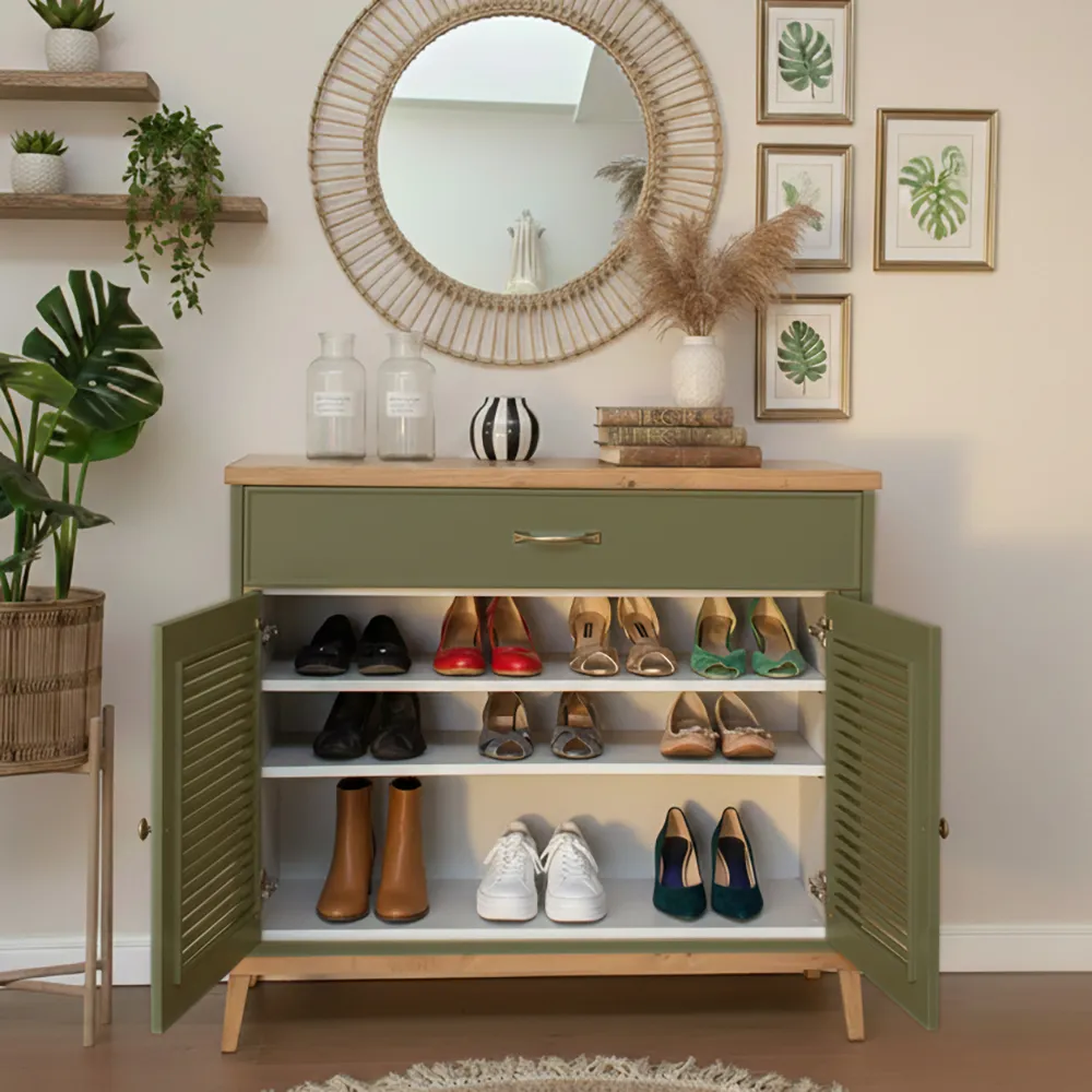 שידת כניסה “קארי” אשר מתאימה גם לאחסון נעליים בזכות דלתות התריס המאווררות