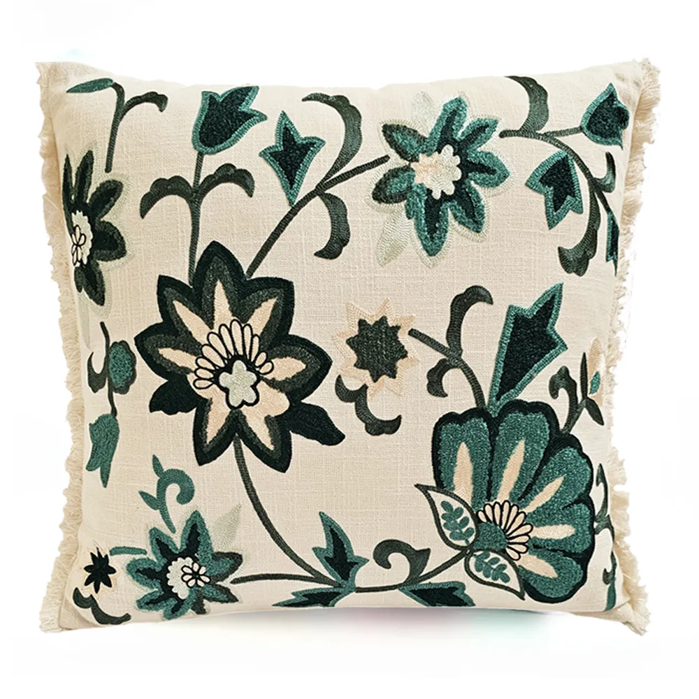 הכרית עשויה מבד כותנה רך ונעים, רקמה בדוגמת פרחים מחוטים במראה משי, פרנזים בצדדים