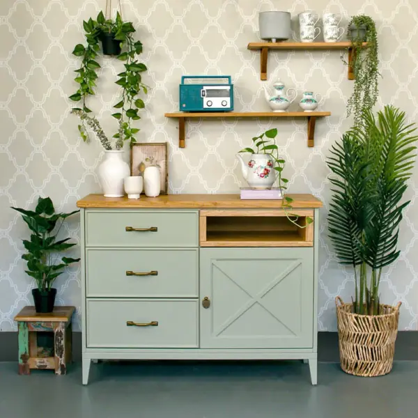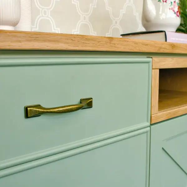 השידה מאם די אף צבוע, פלטה עליונה מפורניר אלון ורגלים מעוצבות מעץ אלון מלא.