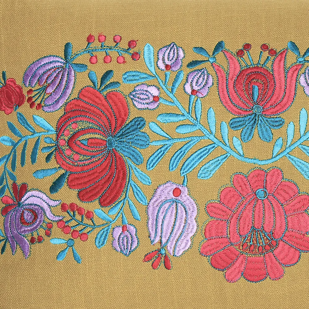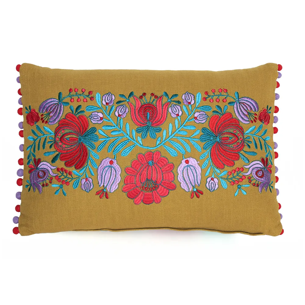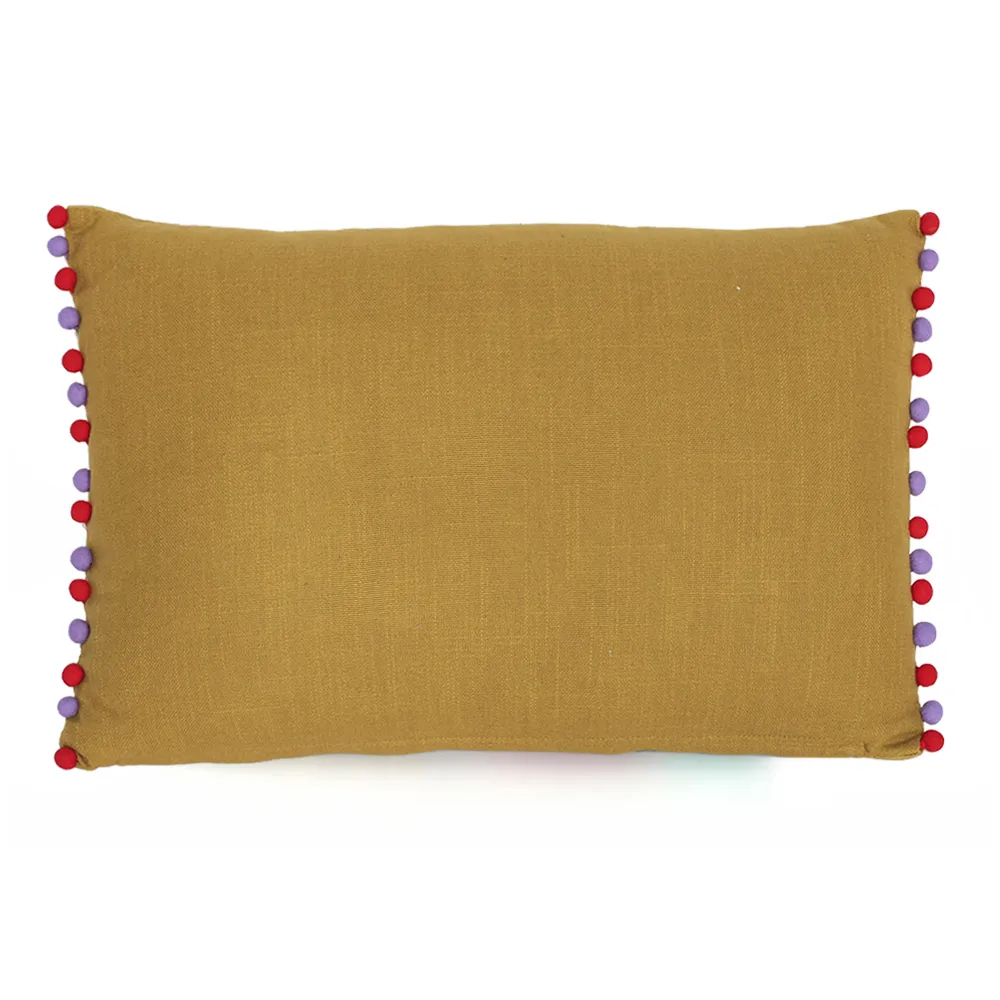 גוון הכרית חרדל חמים, עם רקמה צבעונית ופונפונים דקורטיביים בצדדים, המעניקים לה מראה ייחודי, שמח ומלא סטייל.