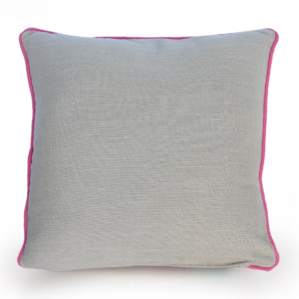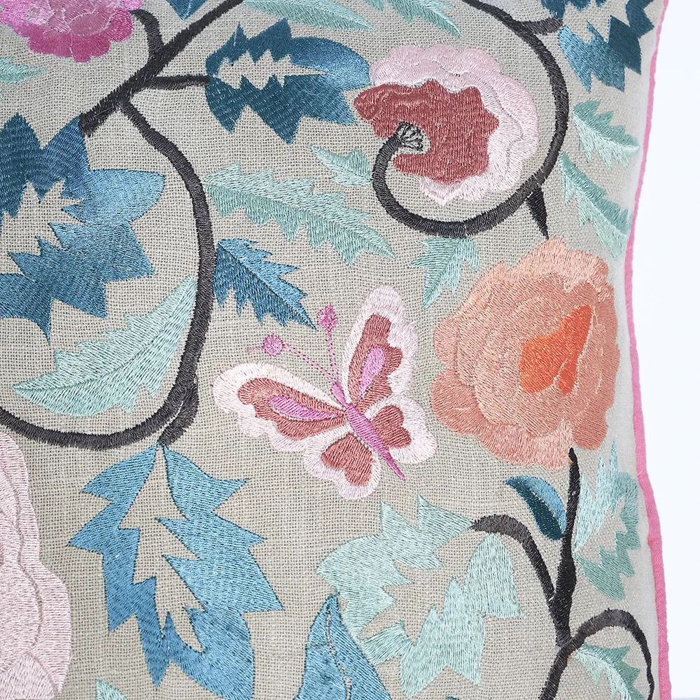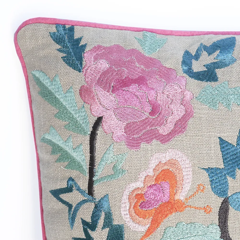 הכרית בצבע טבעי עם ריקמה בצבעי פריחה, פס ורוד מסביב לכל הפריט