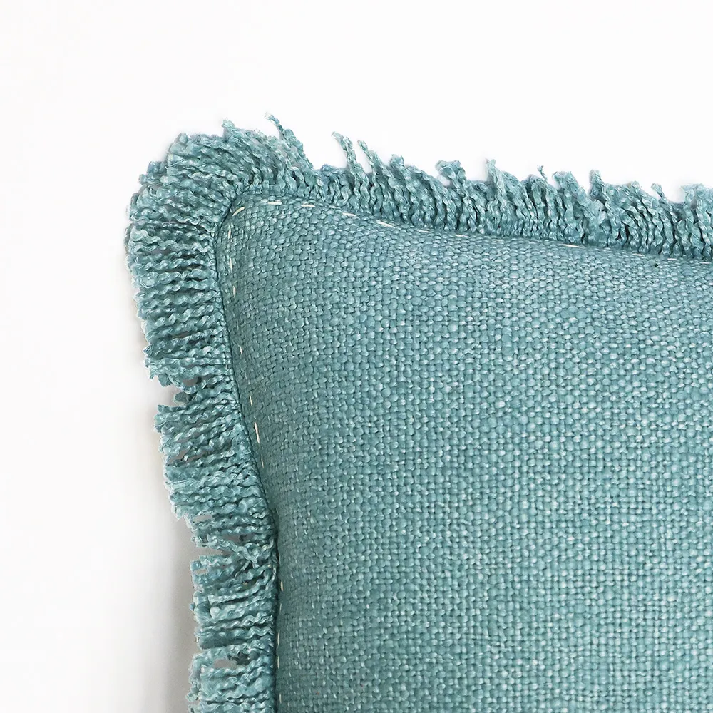 הכרית בגוון טורקיז מעושן , עשויה מבד איכותי בשילוב כותנה ופשתן, עם סרט פראנזים מסביב.