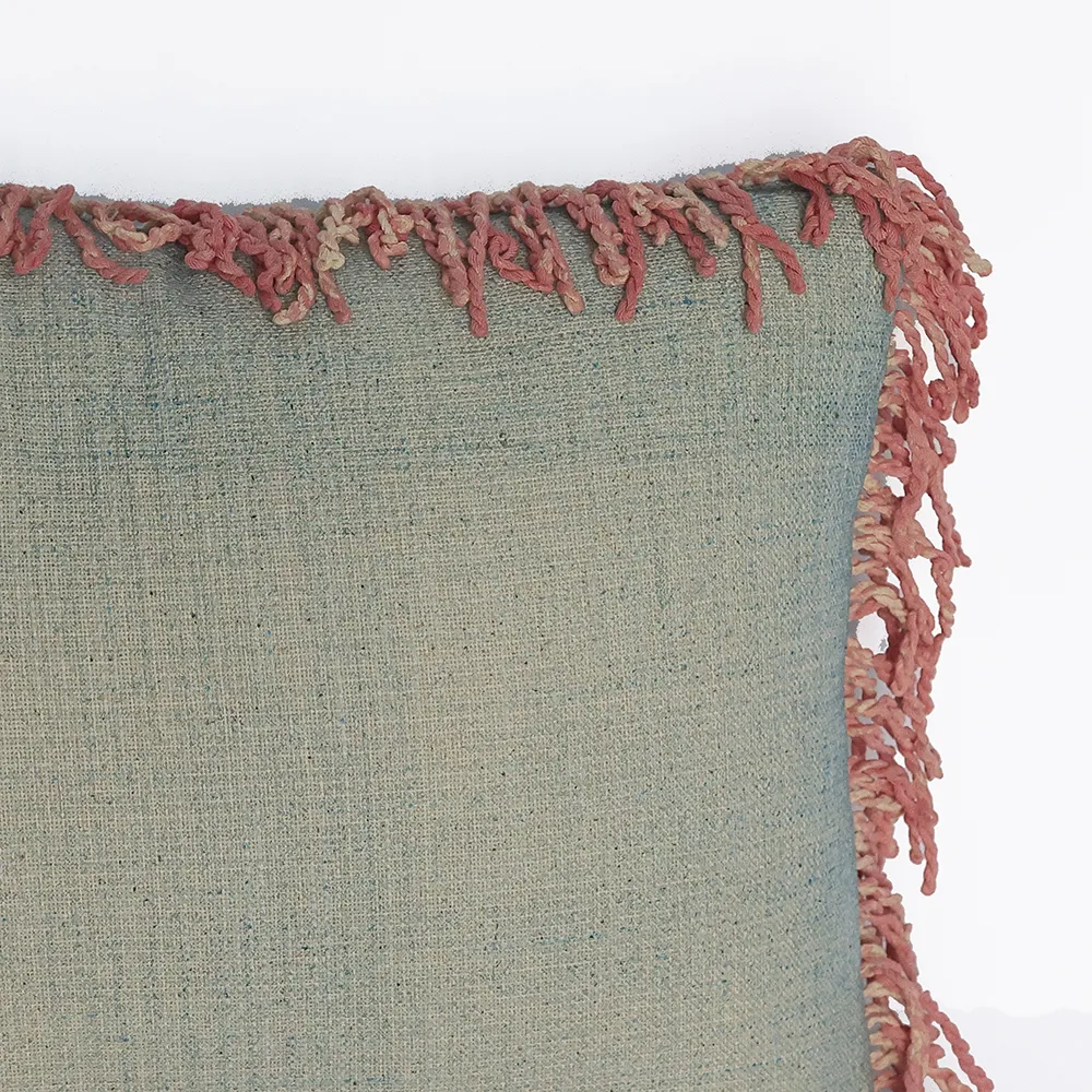 גוון הכרית טורקיז שטוף עם פרנזים בגוון ורוד צבועים ביד, המעניקים לה מראה ייחודי, שמח ומלא סטייל.