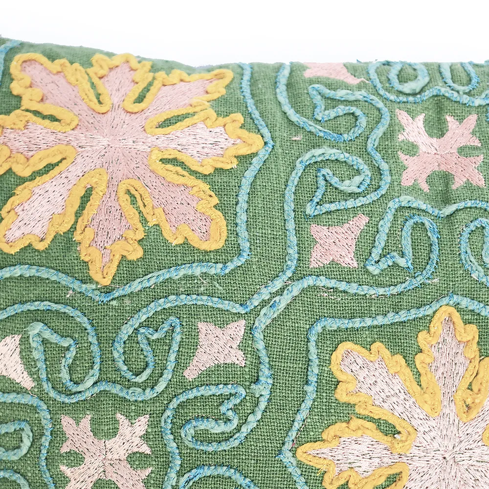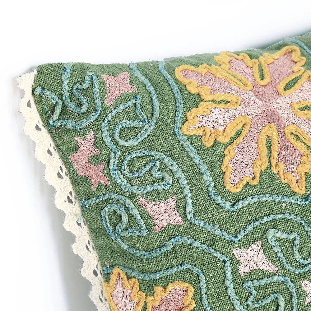 הכרית בצבע ירקות עם סרט קרושה בגוון טבעי. מראה בוהו שיק רומנטי
