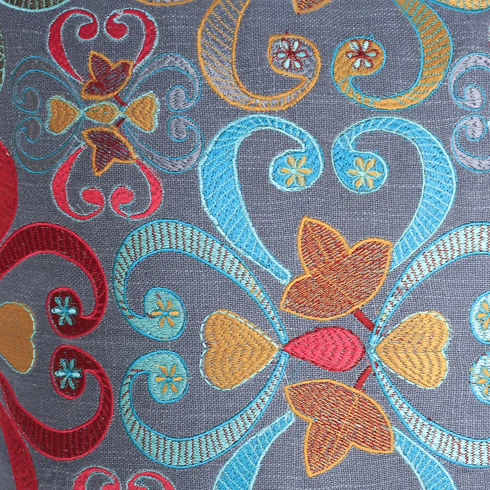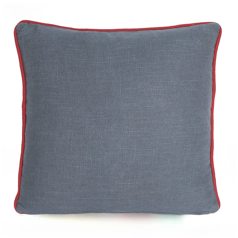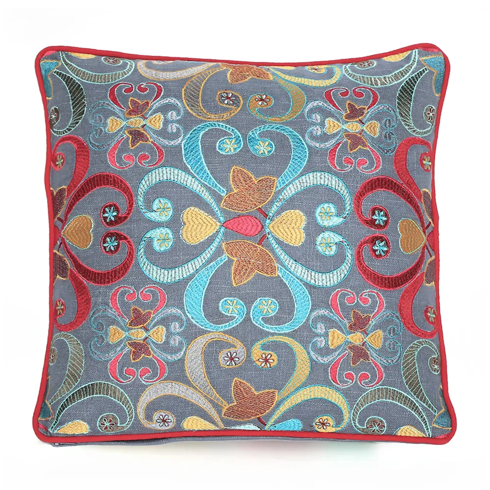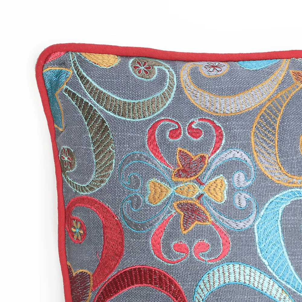 גוון הכרית אפור אלגנטי, עם רקמה צבעונית ופס אדום דקורטיבי בגוון תואם לרקמה, המקיף את הכרית ומעניק לה מראה ייחודי ומוקפד.